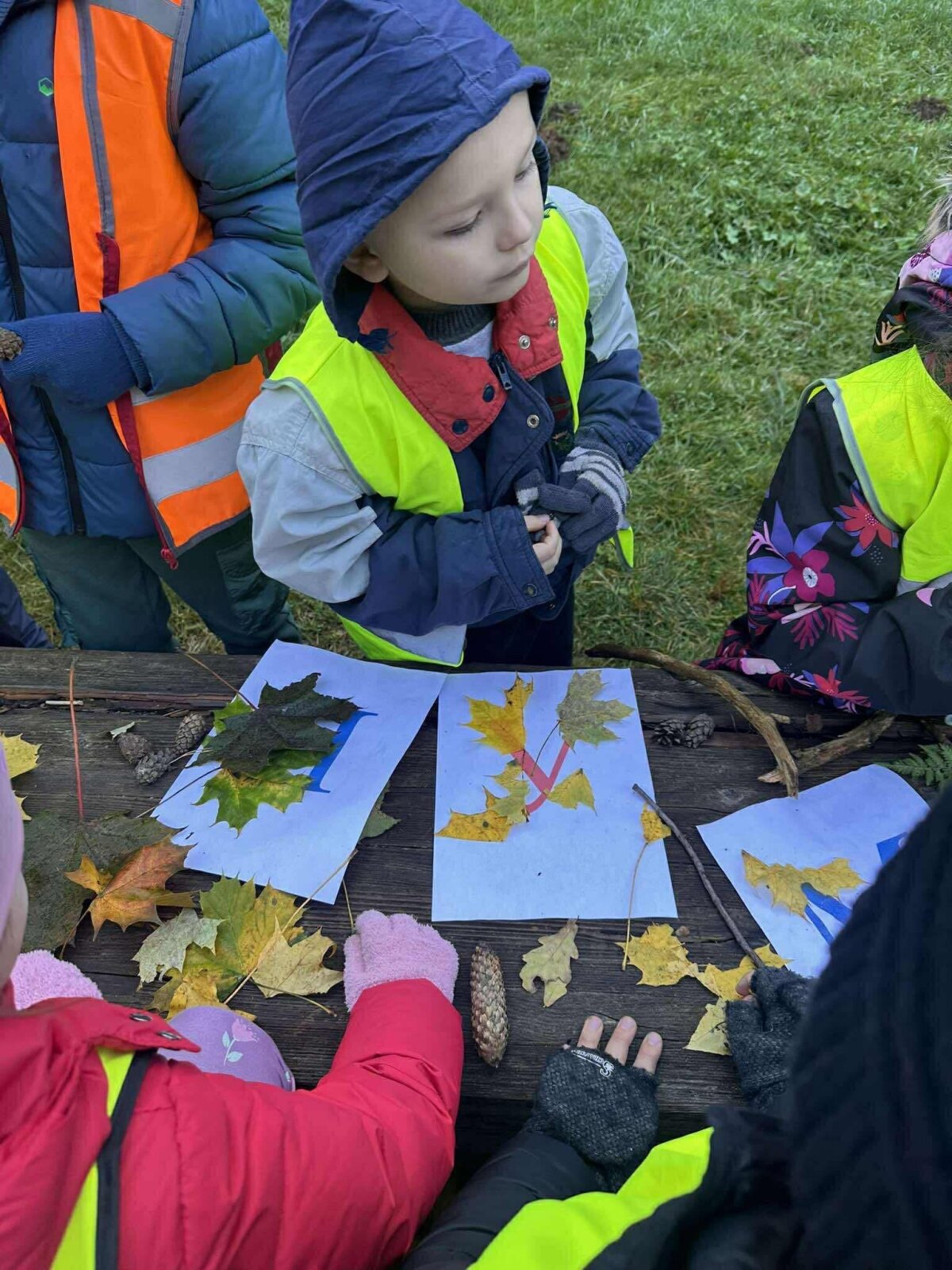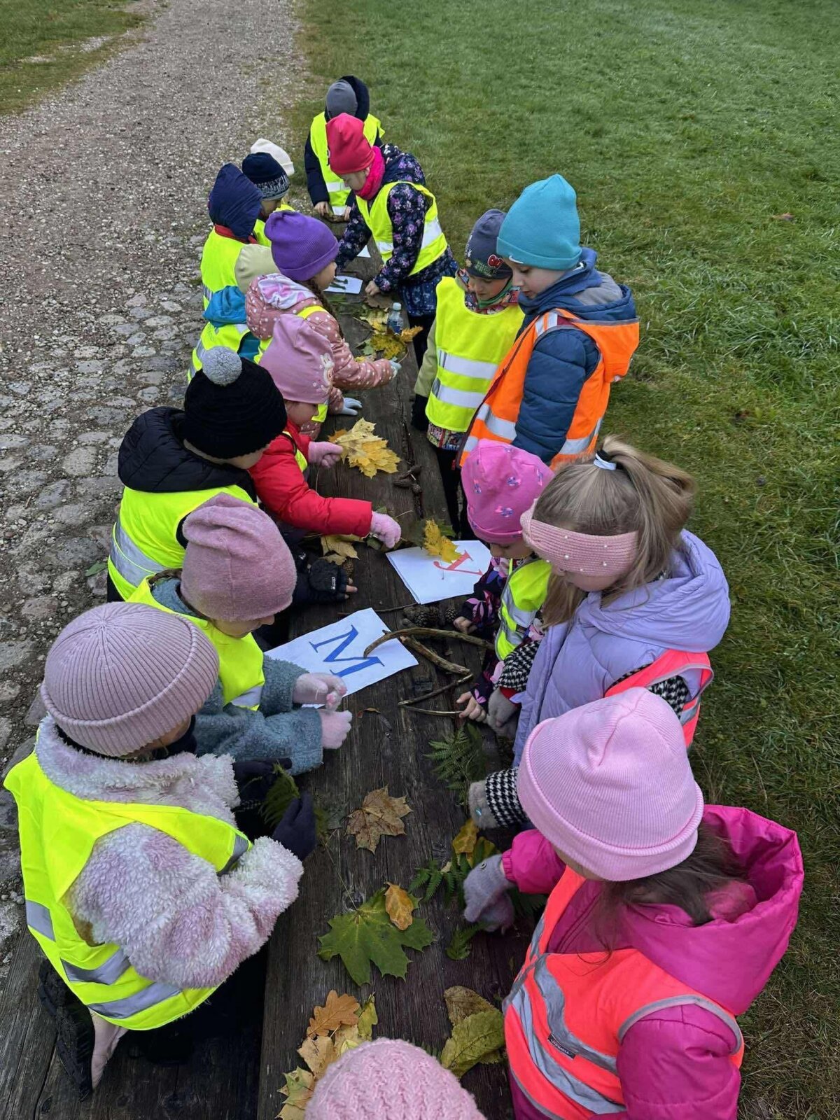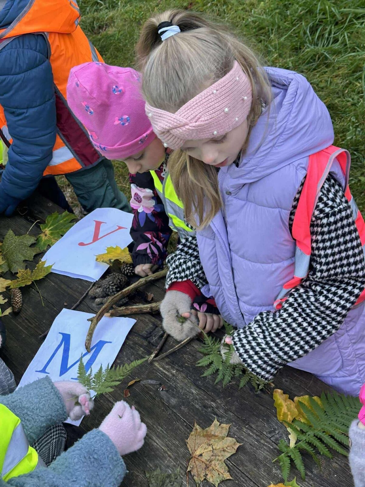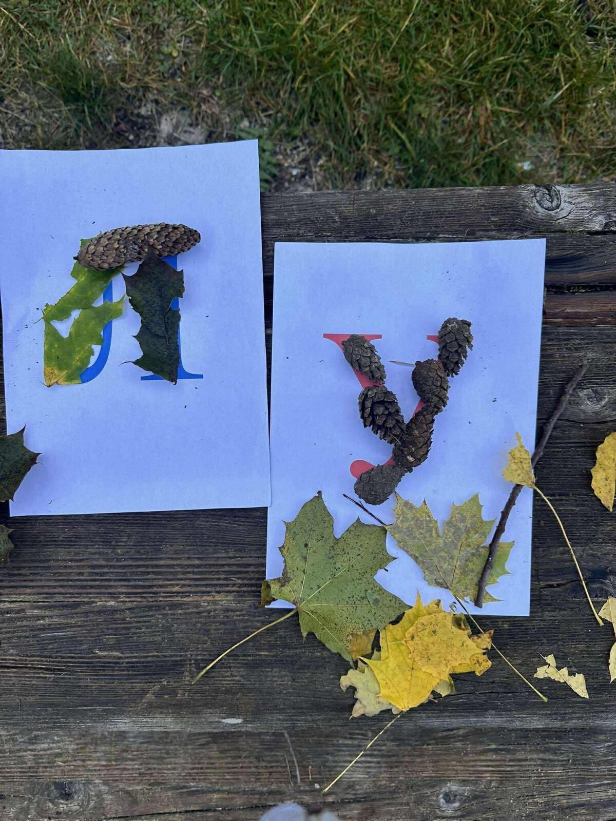Mokiniai entuziastingai kūrė raides iš gamtinių medžiagų – lapų, šakelių, gilių ir akmenukų – bei prisiminė žodžius, prasidedančius tomis raidėmis.